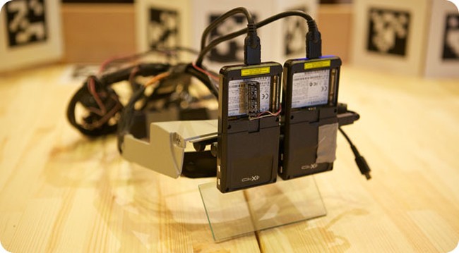 castAR 由两部分组件构成,一副眼镜和一块屏幕,眼镜上左右眼各有两个微型投影机,它们能在屏幕上投射出透射式的 3D 立体图像,人眼不需调整,自然的看着前方就能舒适的看到画面。两个投影机中间有一个摄像机,可以根据屏幕上的红外识别标记来判断用户头部的物理位置和朝向,电脑根据这些数据再调整图像信息,让你动起来时也能看到面前虚拟世界的另一面。眼镜通过 HDMI 接口从外部获得影像信号,摄像机通过 USB 接口同 PC 相连,同移动设备相连的解决方案还在开发中。
