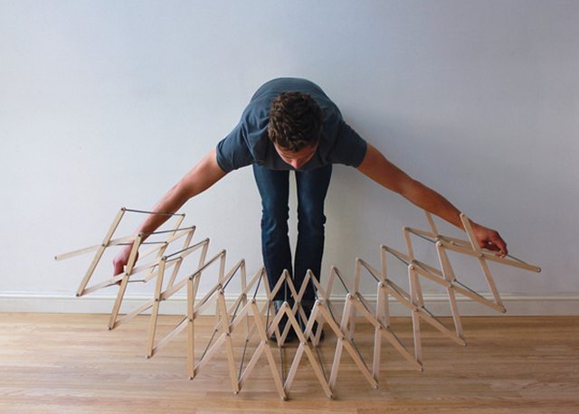 Clothes Horse 是设计师 Aaron Dunkerton 打造的折叠式晾衣架。几十条木胶合板被铝合金棒串接起来,再通过挂钩锁定整个结构。撑开来就是一个 12 角星形,一次可以晾晒多件衣服,且有足够的空间让空气流通起来,让衣服干得更快。不用的时候折叠起来,方便收纳且不占空间。
