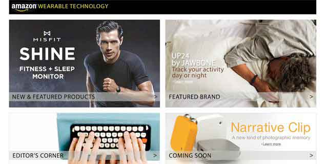 本周二亚马逊上线可穿戴科技产品商店,为用户提供可穿戴科技产品的购买平台。考虑到可穿戴科技的普及度,亚马逊在新上线商店中开辟了教学区Learning Center,为用户提供不同产品的购买指导——包括细致的分类(大致分为健身、健康管理、可穿戴相机、智能手表、家用、儿童与宠物)、大量的解说视频及详细说明等。同时,亚马逊还设计了编辑推荐栏目,列出了可穿戴技术的相关新闻、产品测评等。()