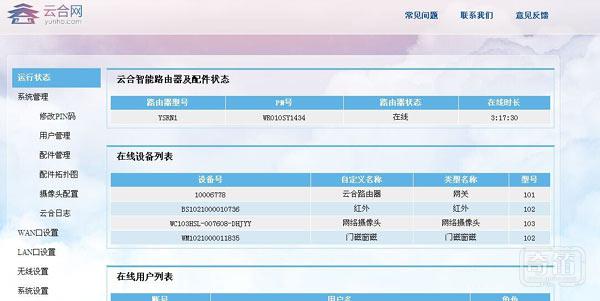 云合无线智能路由与modem的连接上网配置与普通的无线路由没什么区别,这里不进行累述。配置好上网方式和连接后,即可登录到路由的管理页面,路由的默认登陆账号和密码可以在路由的产品说明书找到。在配件管理页面可以看到其他的套装硬件是否连接成功又或者,对在线的套装设备进行管理,可以进行删除,升级,添加等功能。