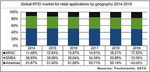 伴随着实体零售市场的冷清,RFID技术在零售业的应用开始爆发。Technavio Research发布的一项研究数据表明,到2019年,全球零售业RFID应用市场规模预计将达到39.1亿美元,与2014年相比增加了30亿美元,在预测期内此类应用的全球RFID市场复合年增长率达40%。